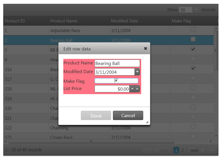 Starting with version 12.2, the updating feature of the igGrid provides Row Edit Templates and allows the end user to edit records in a pop up dialog, as compared to inline editing.