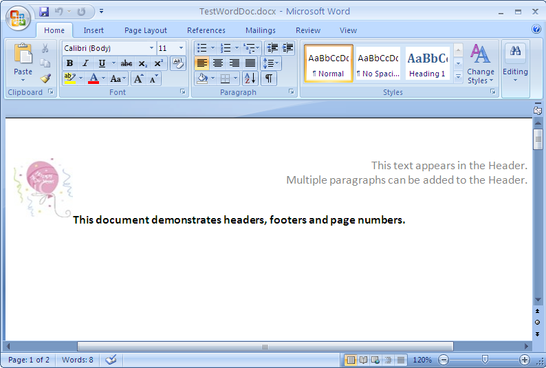 Using the Infragistics® Word library you can create headers and footers that may be as simple as a document title and a page number to images, multiple paragraphs, tables and hyperlinks.