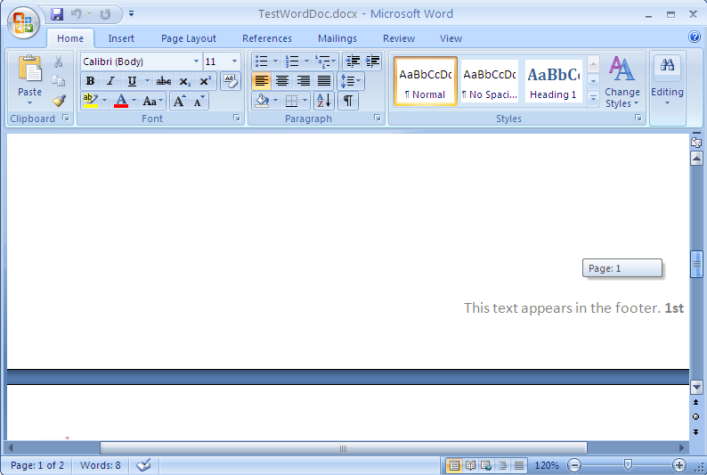 The following screenshots depicts a Word document created with text and page number in the Footer: