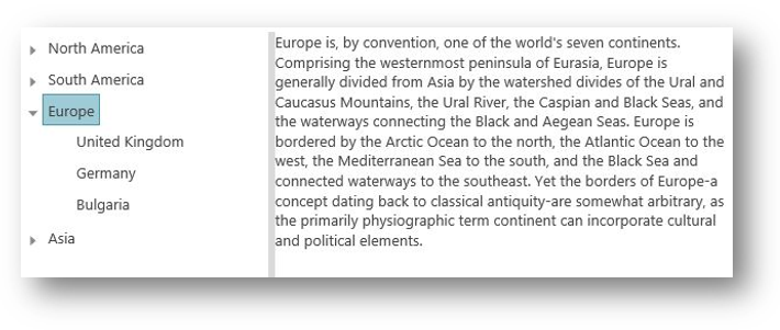 Basic Vertical Splitter: This sample demonstrates how to use the Splitter control to manage a page's vertical layout. The first container contains a Tree control with continents and countries. The left vertical panel has maximum and minimum ranges that a user can resize the panel. When a node is clicked, the description for the selected item is in the right panel.