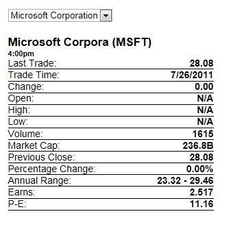 Run the application and the stock information for Microsoft will appear. At first, this will be the only company that has data available. To see data for all of the companies as well as the sample in its completed form, download the full sample here.