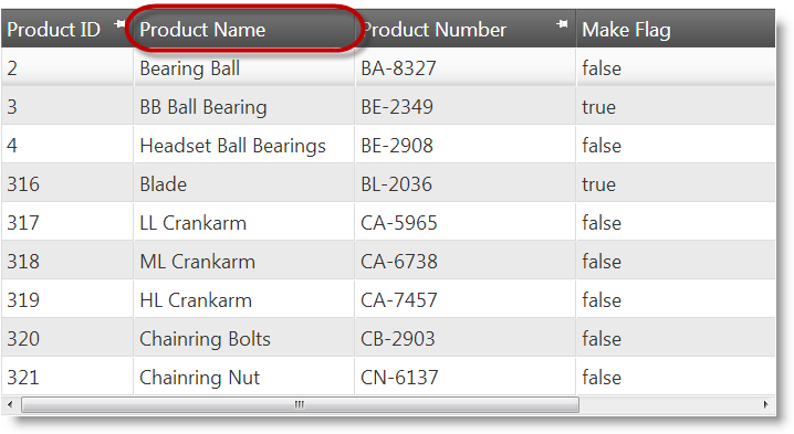 The screenshot below demonstrates Column Fixing being disabled for the Product Name column (with column key “Name”) as a result of the following settings: