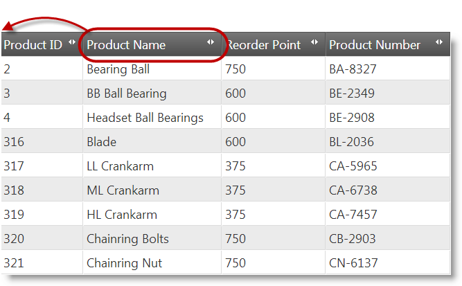 The code in this example moves the Product Number column between the Product ID and Product Name column. The actual moving is performed by Grid Re-Rendering.