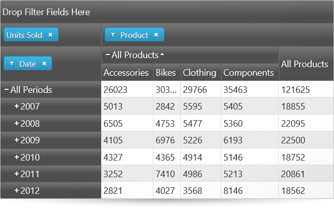 Any of the hierarchies of the data source can be used as columns, rows, or filters in the igPivotGrid. Data source measures are used to for displaying the corresponding numeric values. Users can move the present hierarchies between rows and columns by drag-and-drop. They can also specify the exact place of a hierarchy or measure in its area.