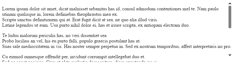 Default (thin) scrollbars - the default (thin) scrollbars are displayed when the user is interacting with the scrollable content, for example when hovering the scrollable container or when using touch interactions. They have no horizontal or vertical arrows and are not interactable with mouse or touch.