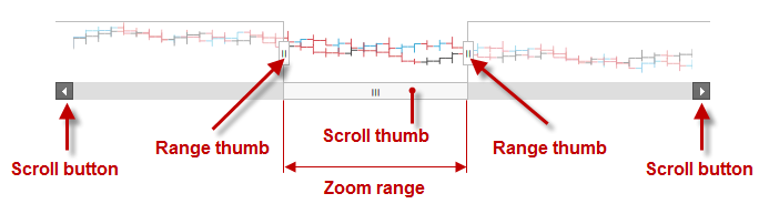 The igZoombar control provides zooming functionality to range-based controls. The igZoombar features a horizontal scroll bar, a thumbnail of the whole range, and a resizable zoom-range window.