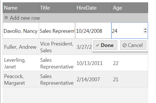 { "ID": 2, "Name": "Fuller, Andrew", "Title": "Vice President, Sales", "HireDate": "\/Date(1269640800000)\/", "Country": "USA", "Age": 22},