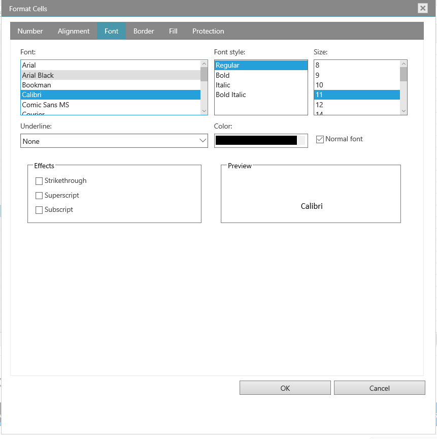 The term font refers to a typeface (for example, Arial), along with its attributes (point size, font style, underlining, color, and effects). Use the Font tab in the Format Cells dialog box to control these settings. You can see a preview of your settings by reviewing the Preview section of the dialog box.