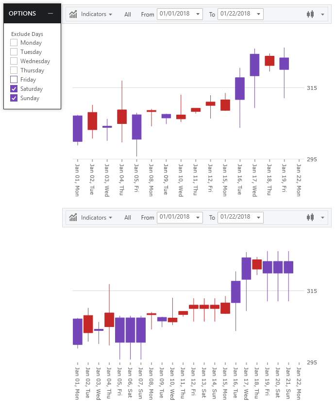 In Financial Chart, you can define scale breaks on X-Axis to exclude custom ranges in your data source or any day of week. For example, exclude all data items that fall on weekends.