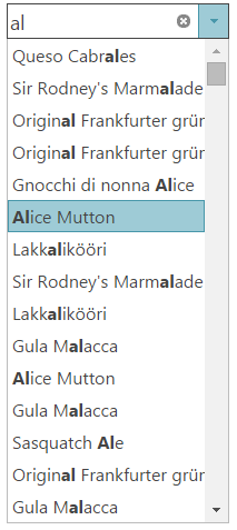 The igCombo auto-suggest feature is the combination of drop-down list filtering and match-highlighting to suggest possible choices to the user. Setting the filteringType to ‘local’ enables list filtering and setting highlightMatchesMode allows for matching text in the dropdown to be highlighted.