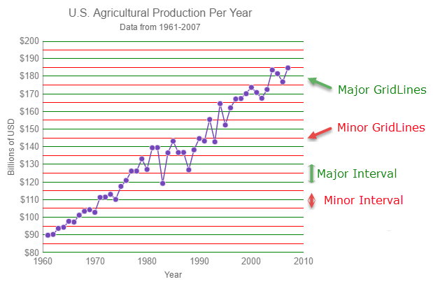 The Major and Minor intervals feature of the igDataChart control allows you to apply intervals with the specified color and thickness to the x and y axes of the igDataChart control.