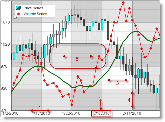 Navigation in a chart is possible with the help of zooming, panning, and the Overview Plus Detail (OPD) window. Zooming is done by mouse scroll or by dragging a rectangle over an area that you want to magnify. Panning is done by dragging with the mouse when the chart is zoomed in.
