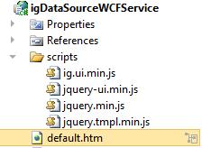 The igDataSource is ‘server agnostic’ which means that it takes no dependency on any type of server-side software platform. With that being said, developers using the .NET framework often want to leverage WCF to provide data in their RIA applications. This topic dissects one of the WCF samples from the samples browser and walks you through the process of setting up your own WCF service to deliver XML data to the igDataSource in an ASP.NET application.