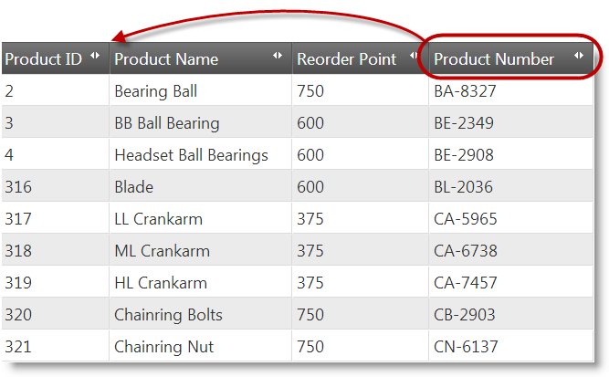The code in this example moves the Product Number column between the Product ID and Product Name column. The actual moving is performed by Grid Re-Rendering.