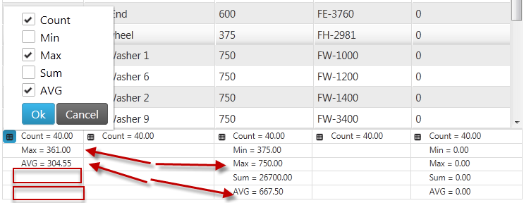 There are two rendering modes defining how calculatins are performed. They are managed by calculateRenderMode property. This option specifies if the calculation should be made instantly or after the OK button is clicked. If the option is set to onselect, no OK/Cancel buttons appear (the image on the right), when check/uncheck summary it’s updated instantly and when we click outside the drop down menu that means we are ready with our choice. When option is set to okcancelbuttons (the image on the left) when we check/uncheck summaries, they are not calculated, but just selected/unselected. When we click outside the drop down that operation is equal to cancel button click.