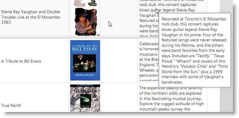In this example, the tooltips are configured to display over every column that contains text and not over the columns that store images.