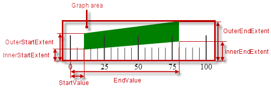 • Along the scale – the Graph area begins at either edge of the control and ends at the opposing edge of the control. Both the starting and ending positions of the scale are measured against the starting edge of the Graph area (the left edge at horizontal orientation or bottom edge at vertical orientation).