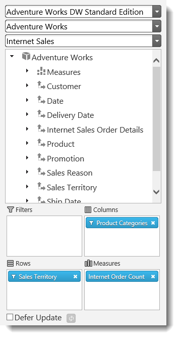 igPivotDataSelector is an interactive UI control (a jQuery UI widget) that enables users to select data slices, typically, when data is being visualized in an igPivotGrid™.