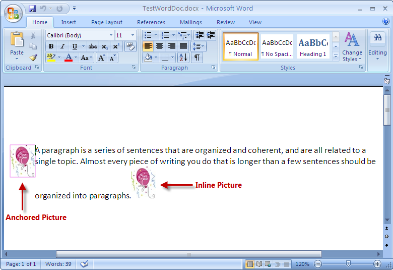 Note: The code to add anchored and inline images must be between the StartParagraph and EndParagraph methods of the WordDocumentWriter object.