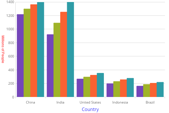 You can customize the look and feel of the category chart's x-axis and y-axis titles in many different ways such as applying different font styles, margins, and alignment. This can be achieved through the following properties: