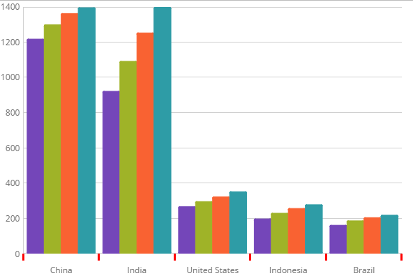 In the igCategoryChart™ control, you can change the length, thickness and color of the x-axis and y-axis labels using the following properties: