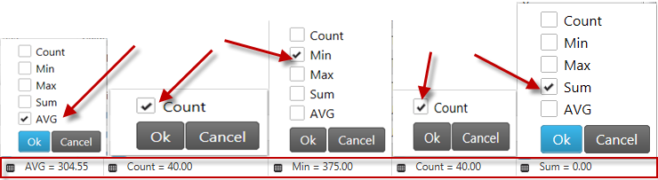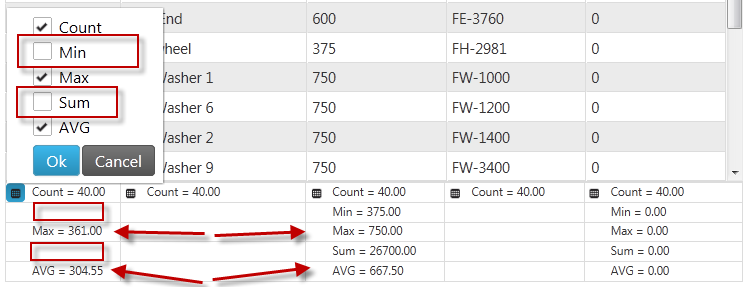 There are two rendering modes defining how calculatins are performed. They are managed by calculateRenderMode property. This option specifies if the calculation should be made instantly or after the OK button is clicked. If the option is set to onselect, no OK/Cancel buttons appear (the image on the right), when check/uncheck summary it’s updated instantly and when we click outside the drop down menu that means we are ready with our choice. When option is set to okcancelbuttons (the image on the left) when we check/uncheck summaries, they are not calculated, but just selected/unselected. When we click outside the drop down that operation is equal to cancel button click.