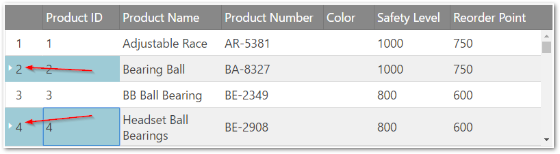 Selecting cells or rows with RowSelectors requires initializing the Selection feature for the grid. RowSelectors do not initialize the Selection feature automatically and expects you to enable it if needed. Without the Selection feature, RowSelectors can still be used, for example, for their row numbering functionality. In the example below, multiple-selection is enabled. Red arrows show row selectors column.