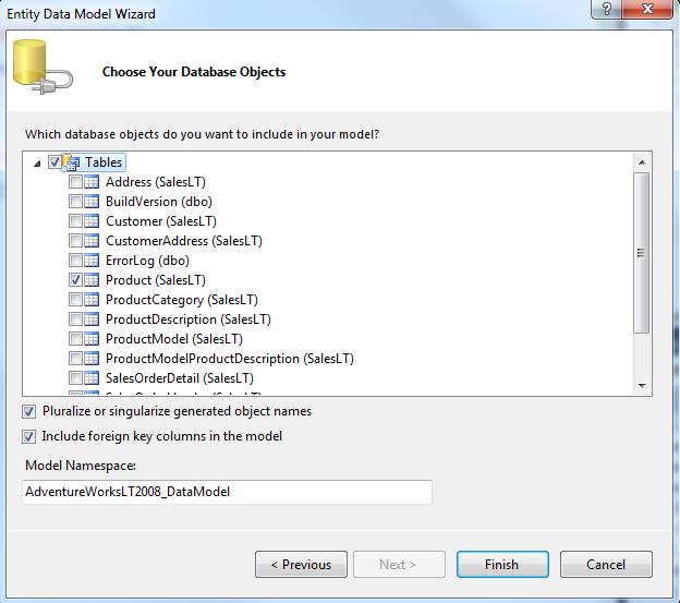 Next, add an ADO.NET Entity Data Model named AdventureWorksEntities.edmx to the project and point it to the AdventureWorks database: