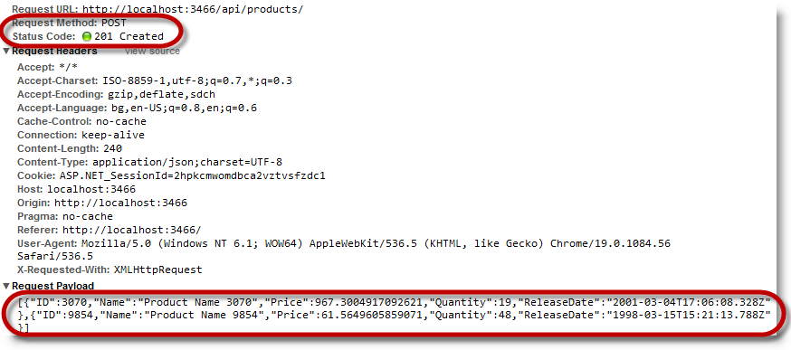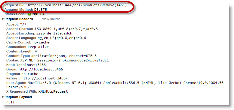 In the following screenshot you can see the REST request made by the igGrid when the saveChanges method is executed.