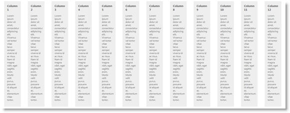 With the Column Layout, the container is divided into 12 columns. Each set of 12 consecutive columns is placed in separate row. The rows and columns are made of DIV sections. That layout itself consists of defined CSS classes with measurement in percentages. They are applied to the HTML in order to achieve the desired column arrangement.