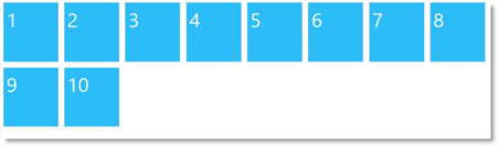 With the Flow layout, the content items arrange from left to right and wrap onto a new line (to the utmost-left again) when they reach the right edge of the container. The items’ order follows the sort order of the array through which they are supplied to the igLayoutManager control. The following picture schematically presents how nine items will be arranged when the container’s width allows for only seven of them in one row.