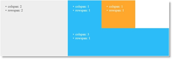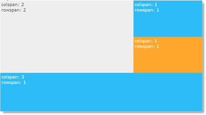 Rows and columns can be spanned for accommodating items of different sizes. Note that items can only have sizes that are multiples of the grid cell size in the respective dimension (width or height). The following picture presents schematically 4 items of different sizes arranged in a 3x3 grid. The topmost-left cell spans over the adjacent cells one column to the right and one row downwards. On the third row, the utmost-left cell spans to the right over all across all 3 columns.
