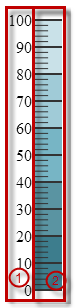 • Graph area (2) – The area for displaying the needle, the tick marks, the ranges, and, optionally, the numbering labels of the linear gauge. All extent-related properties for these visual elements (except for labels) are measured against its edges. The Graph area serves not as a placeholder but as a frame of reference for positioning the scale inside the control (More precisely, for positioning the visual elements of the scale).
