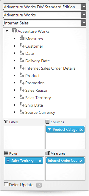 The igPivotDataSelector is a client-side component accompanied by an Ignite UI for MVC implementation that allows the component to be used in the CS/VB code of an MVC View. It allows also consuming data from the View’s Model (using igOlapFlatDataSource). When using the Ignite UI for MVC igPivotDataSelector, there are two ways to bind it to data: