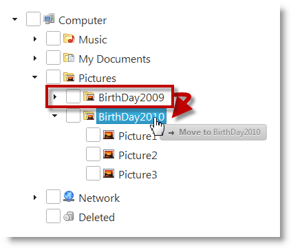 You can also specify the action to be performed upon the drag-and-drop move – copying or pasting – and whether the user should have the option to select between the two. This is managed by configuring the igTree control to one of the several supported Drag-and-Drop modes.
