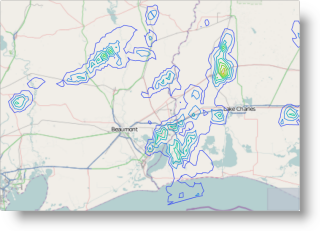 Visualizes colored geographic area based on triangular irregular networks (TINs) defined in a triangulated (ITF) file or other custom triangulation data source. Geographic coordinates and a value member are also needed. This can be used to depict terrain elevation, population density, average/current temperature and others.