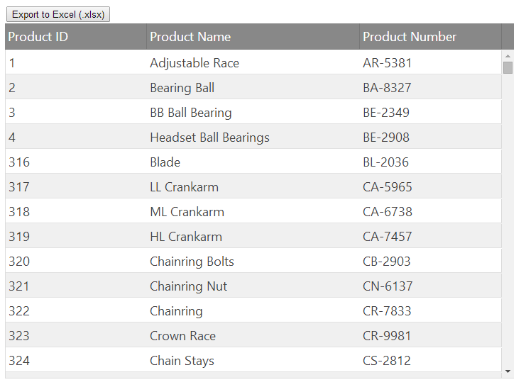 The body of this document consists of a button, which when clicked invokes the exportWorkbook function. This topic demonstrates how to construct this function to export the grid data to an Excel workbook. The related sample also contains a table into which the igGrid is placed by the initialization code above.