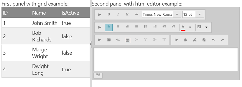 Basic Horizontal Splitter: This sample demonstrates how to use the Splitter control to manage master/detail grid with horizontal layout. The first container contains a master grid with customers. After a row is clicked in master grid, in the second container is shown grid with orders that are made by this customer.