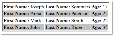 '<tr class="alternateRow">' +'<td><b>First Name: </b>${firstName}</td>' +'<td><b>Last Name: </b>${lastName}</td>' +'<td><b>Age: </b>${age}</td></tr>'+