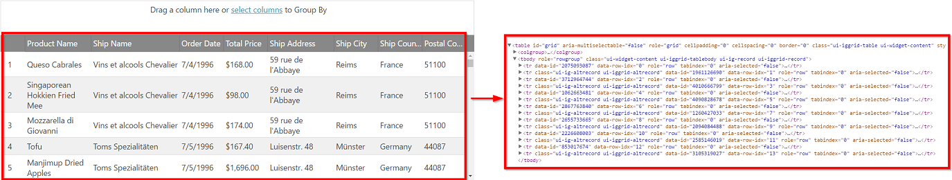 Fixed Row Virtualization is enabled by setting the rowVirtualization option of the igGrid control to true.