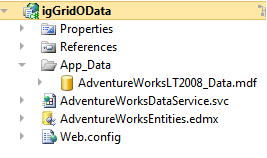 Next add a WCF Data Service to the project named ‘AdventureWorksService.svc’: