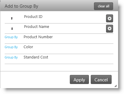 | Grouping with deferred grouping enabled | The user selects the desired column(s), and then applies the grouping action by clicking the Apply button. |