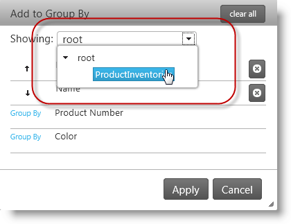 igHierarchicalGridwidget, an additional dropdown is available which first allows you to select any child layout and then allows you to choose column(s) to group by.