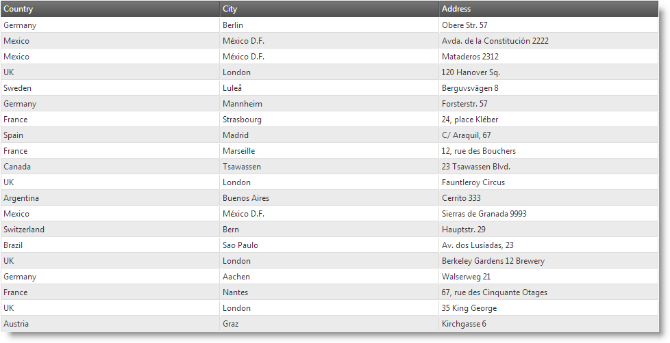 The following screenshots demonstrate how the igGrid looks in the different RWD profiles. In the Desktop profile, the grid has 3 columns: Country, City, and Address. In the Tablet profile, the Country column is hidden. In the Phone profile, the Country and City columns are hidden, but their data is appended to the Address column.