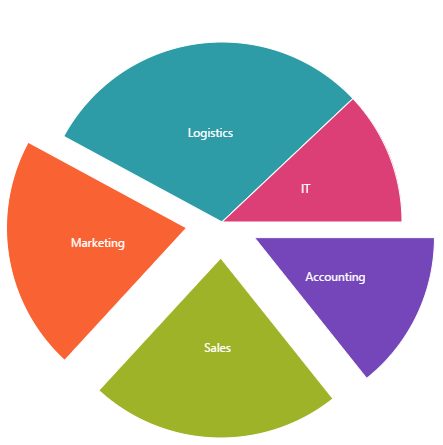 Add the following code into your ASP.NET MVC view in order to instantiate an igPieChart and assign the list. Note how the data model of the strongly-typed view is mapped to the chart with the PieChart(Model) call. Further, the ValueMemberPath() method maps the item.Budget property to the slices’ size and the LabelMemberPath() method maps the item.Department property for each data item to slices’ names. The DataBind() method does the actual data binding and at the end the Render() method emits the final JavaScript code to be executed on the client-side.