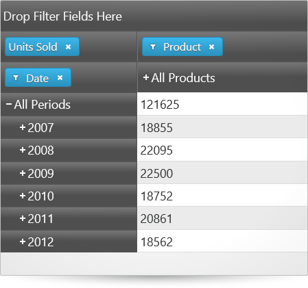 Any of the hierarchies of the data source can be used as columns, rows, or filters in the igPivotGrid. Data source measures are used to for displaying the corresponding numeric values. Users can move the present hierarchies between rows and columns by drag-and-drop. They can also specify the exact place of a hierarchy or measure in its area.