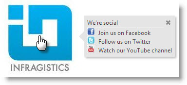 The following screenshot demonstrates a popover displayed over an image element (the Infragistics® logo) as the user points with it with the mouse. The popover here works as a context menu from which user can select an option. The used can also close the popover with the close button.