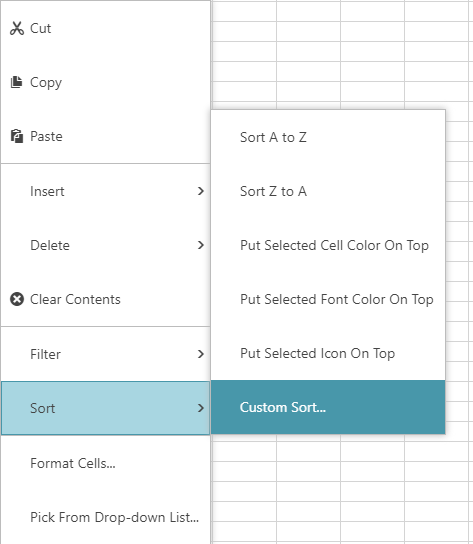 The dialog can be opened by first displaying up the igSpreadsheet's context menu. This can be achieved by either right-clicking or pressing (Alt + Shift + F10) on a cell that pertains to a worksheet, filter region or table. Next, select the Sort option followed by Custom Sort option (as shown in the image below) and the dialog will appear.