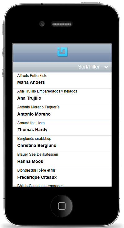 The new igListView™ control provides list display and interaction functionality for jQuery Mobile platform. The mobile list view control can be bound to all the data sources available to igDataSource as well as to UL or OL HTML elements. The control supports hierarchical navigation following the jQuery Mobile navigation concepts. Templates can be used to customize the display and layout of list elements. Sorting, filtering and grouping functionality are also available. The mobile list view control supports load on demand to improve performance at runtime.
