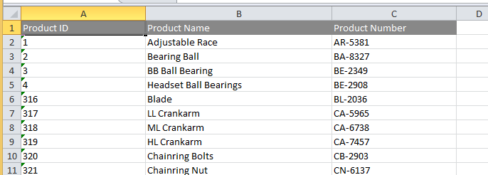 Exporting the data cells is very similar to exporting header cells. Once again, the loop over the rows should iterate both the grid row index and the worksheet row index so no exported rows overlap in the worksheet. In this case, the code does not need to export the format of the cells and can just export their values: